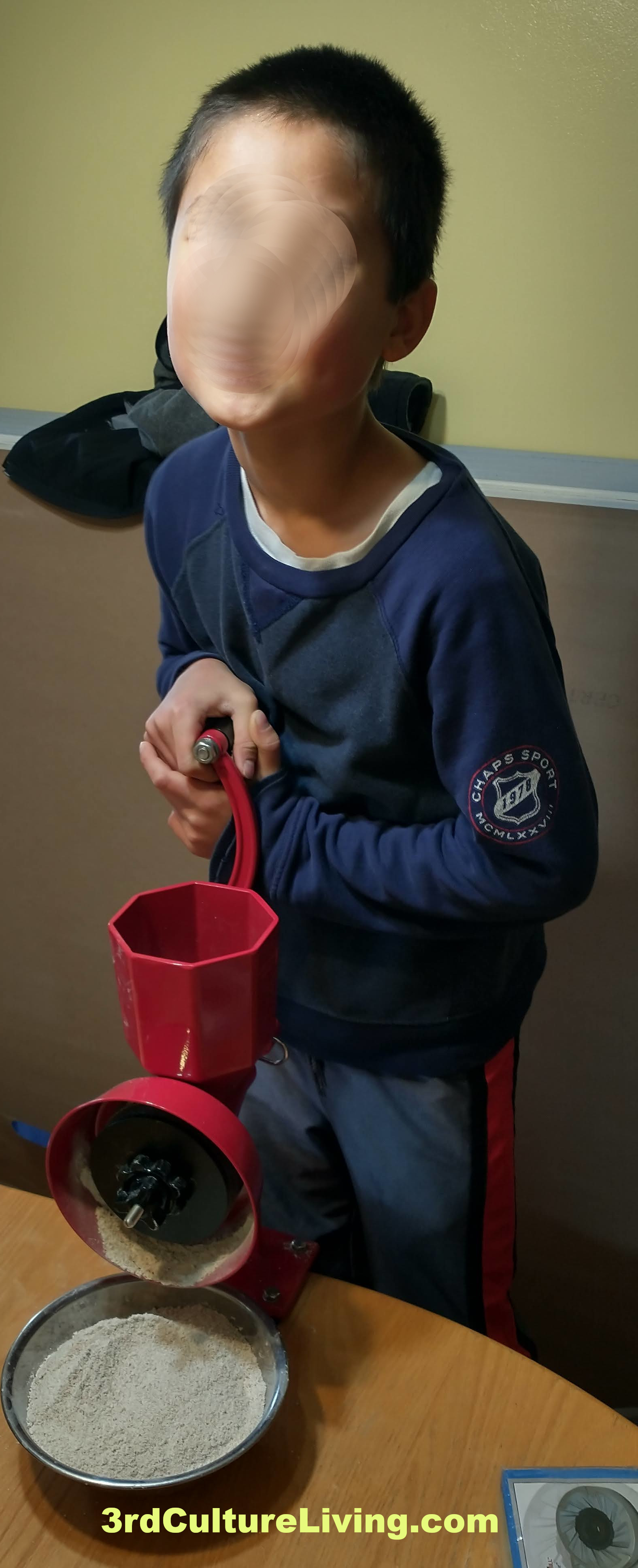 - Flour…cise – You’ve heard of exercise (at least as a distant concept :o). We have “flourcise”. This is where you set up the manual grain mill and go at it. We often take turns with Elijah and Isaiah taking 50 rotations and Rob taking 200 to rest between turns. This time, Isaiah went all at it and kept going, and going, and going and did most of the grinding for us. I was amazed. (As a note: We often buy our flour from Azure, but didn’t get that order in and Costco and Walmart didn’t have quality flour, so we dug into the organic wheat berry stash and started spinning.