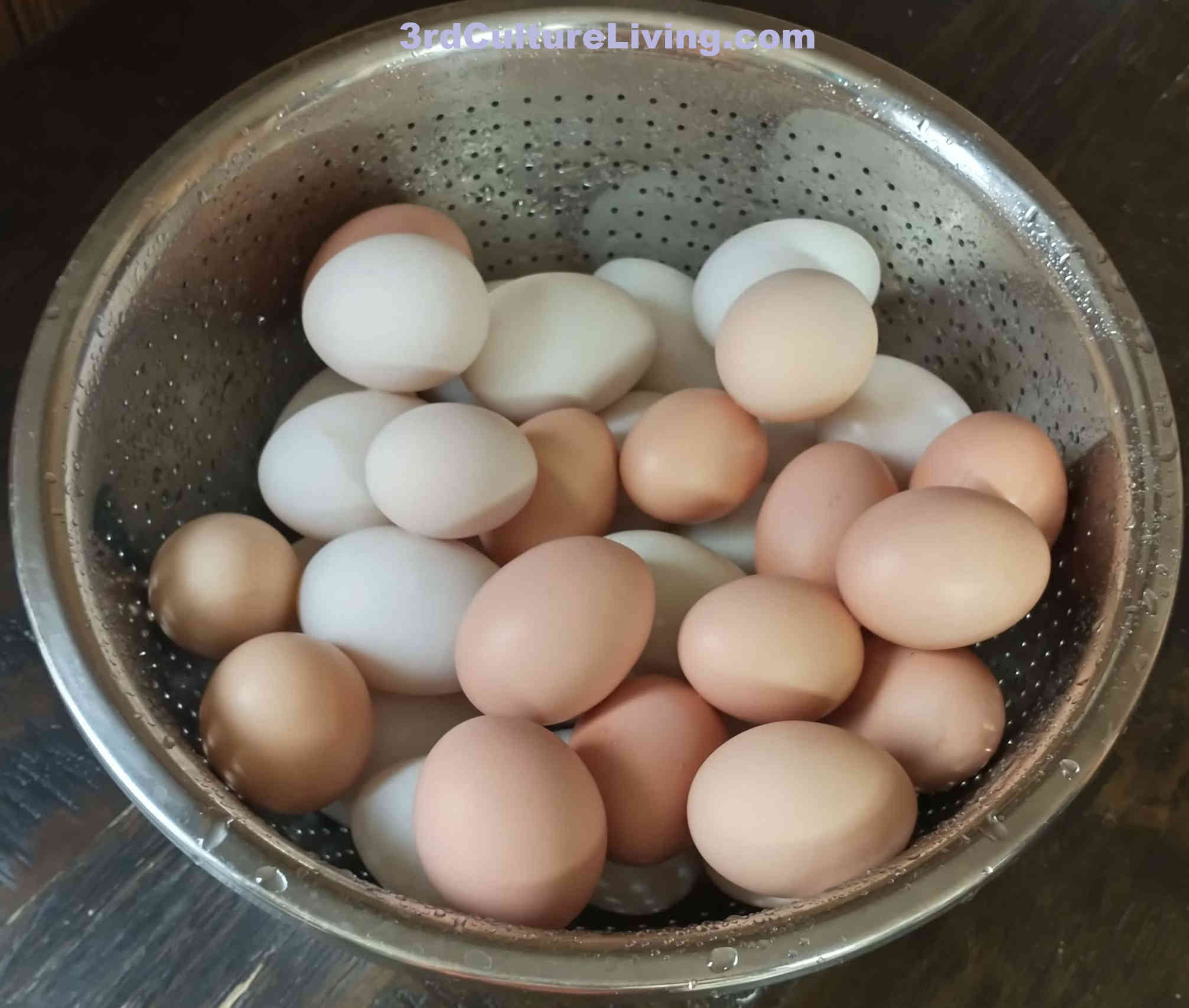 #2 Do the float test. If the eggs are floating, they are not fresh. Too much air has crept into the shell over time. You want the eggs to sink to the bottom if you want fresh ones. You want really fresh eggs if you plan to hatch them with a higher hatching rate. However, if you collect your own eggs, you want to choose the older eggs to make boiled eggs. It will make your peeling job much faster. Don’t boil the freshly collected eggs if you can avoid it, unless you want to test your children’s patience and meticulous work! Put the boiled eggs into the icy cold water after you drain the batch of boiling hot water. This trick will usually make your peeling work like a breeze.