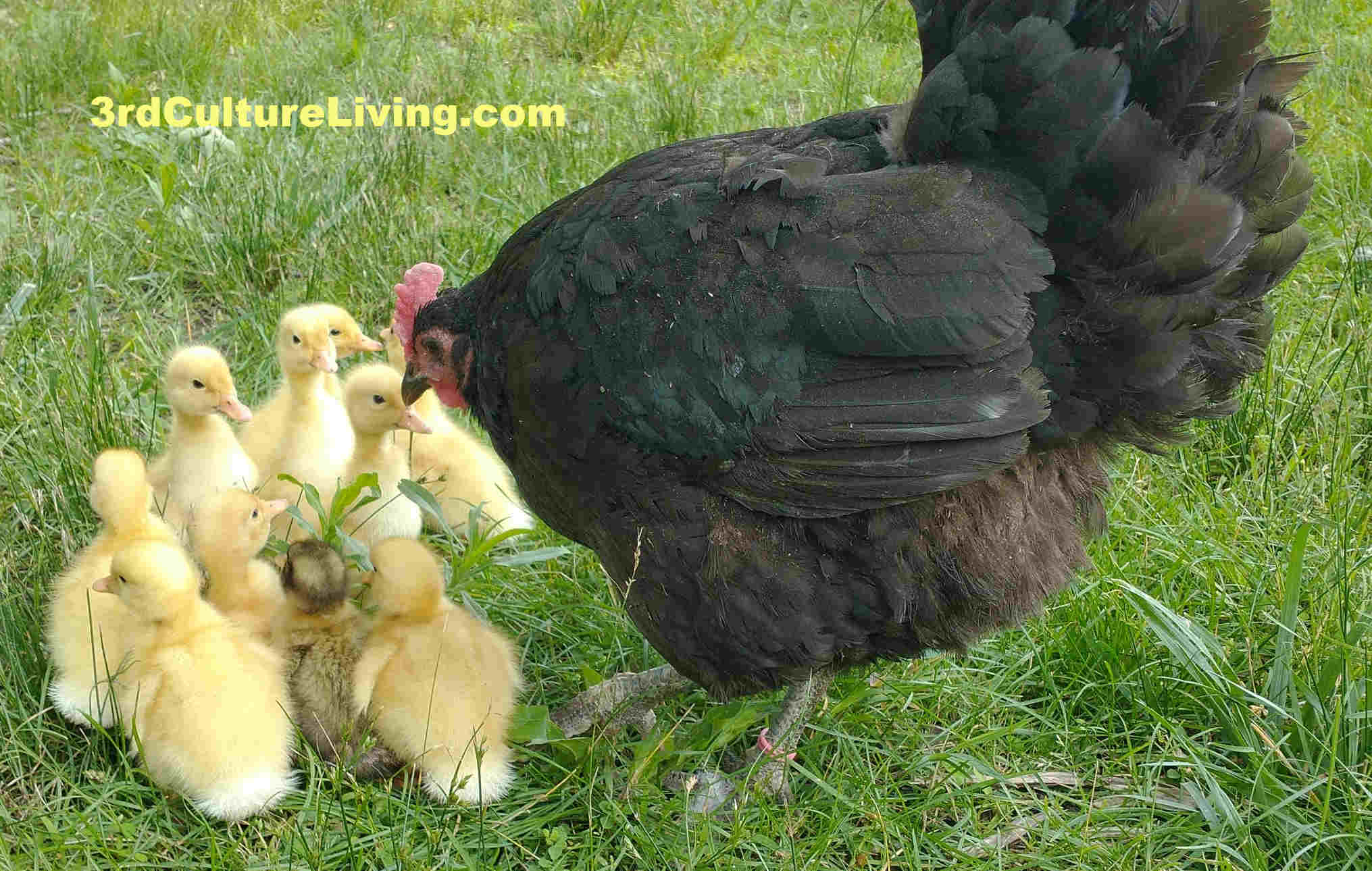 This spring we had three broody mother hens. One had 8 chicks hatch. One had 13 chicks hatch. And the last had 10 chicks hatch. It’s fun seeing the chicks since they aren’t actually (or exclusively) her eggs. The eggs could be from any of our various types of chickens, so when they hatch they are a whole mix of colors. The third momma hen had an even more interesting group of chicks. Her eggs were all duck eggs that we put under her, so now we have 10 little ducks following their momma hen around. Being ducks, they are naturally drawn to water, but can’t swim quite yet. When they are splashing around in shallow water, you can see the concern from their momma hen. In a few weeks, they will likely discover their full duckness and go off on their own, while momma hen returns to her normal routine. (This will happen for the baby chicks as well, and is normal.)